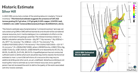 The Silver Hill mine is now controlled by a tiny Canadian junior named Metalsource Mining (MSM-C). In 2023 SRK was asked to provide a historic estimate for Silver Hill called a mineral inventory showing 347,422 tonnes worth about $513 in metal in the ground at today’s prices.
