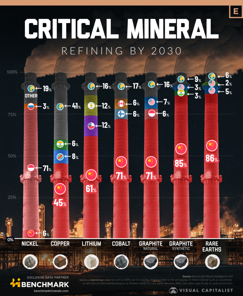 By 2030, China will play a dominant role in lithium, rare earth elements (REEs), cobalt, and graphite, controlling nearly 60% of all critical mineral refining. Such concentrated processing capacity offers efficiencies that may lower costs but heightens geopolitical risk for downstream buyers.
