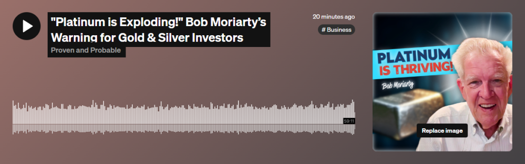 Categories Base Metals Energy Exclusive Interviews Junior Mining Precious Metals “Platinum is Exploding!” Bob Moriarty’s Warning for Gold & Silver Investors Post author By admin Post date December 21, 2025 Rumble: https://rumble.com/v6zpqwa-blood-in-the-streets-bob-moriartys-platinum-silver-junior-miners.html ← West Point Gold Expands Northeast Tyro to Depth and to the North, Drilling 24.4 m of 5.92 g/t Au from 120.4 m and 16.8 m of 8.3 g/t from 158.5 m → Apollo Silver Announces Correction to Warrant Terms of $25 Million Strategic Investment by Eric Sprott and Jupiter Asset Management