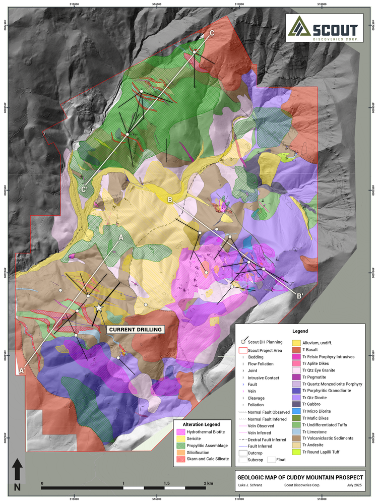 | Coeur d’Alene, Idaho – January 15, 2026 – Scout Discoveries Corp. (“Scout” or the “Company”) is pleased to announce that drilling commenced at the Cuddy Mountain Project in late fall 2025 using one of the Company’s wholly owned drill rigs. This work is part of Scout’s planned Phase I core drilling program of up to 10,000 meters, detailed in the April 9th, 2025 news release. With the recent closing of Scout’s private placement (see January 5th, 2026 news release), the Company is now positioned to provide material updates on the drill program and other corporate developments.The ongoing Phase I drill program marks the first drilling at Cuddy Mountain in over 40 years. Drilling began at the Climax target (Figures 1 & 2) and will continue through the winter. Two completed holes and a third underway beneath the strong molybdenum soil anomaly at Climax shows it is a separate porphyry center from IXL. Assays are pending on both completed holes. Drill core observations reveal multiple porphyry intrusions, high-temperature alteration, and abundant sulfide-rich veins of varying generations ranging from early biotite halo, banded quartz molybdenite, magnetite, and sericite-chlorite-pyrite-(chalcopyrite) veins that are consistent with porphyry copper-molybdenum systems. Drilling will continue through the winter to vector toward inferred higher-temperature mineralization zones based on zoning observed to date.As snow melts in the spring, the Company plans to transition drilling to the IXL and Railroad targets while continuing work at Climax (Figures 1 & 2). Scout retains the flexibility to deploy additional rigs from its fleet of five surface core drills, should results warrant expanded drilling. |