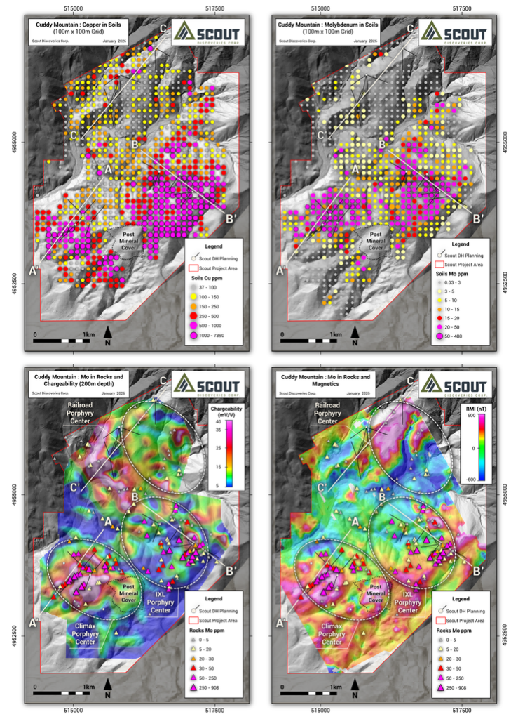 | Curtis Johnson, Scout’s President and CEO commented, “The drill targets at Climax and IXL, including historic intercepts of 177 meters @ 0.34% Cu from surface with 40 meters @ 0.78% Cu, represent some of the most compelling near-surface porphyry targets in the broader Cuddy Mountain-Hercules mineral belt. This belt is emerging as the most significant new porphyry copper district discovered in the United States in well over 50 years. We look forward to utilizing our internally owned drills throughout 2026 to efficiently deploy shareholder capital and understand the full potential of the Cuddy Mountain project.” |