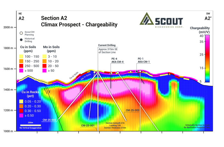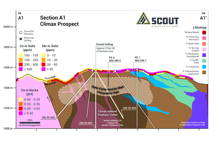 The Climax area has emerged as one of the most compelling untested targets on the Cuddy Mountain project, having not been identified as a porphyry copper target prior to Scout’s 2024-2025 work programs. The Company utilized systematic geologic mapping, soil and rock geochemistry, and geophysics to guide drill targeting. Climax delivered impressive coincident IP, magnetic, and copper/molybdenum in soil anomalies in an area with newly discovered stockwork quartz-sulfide veining and multiple phases of porphyry dikes (Figures 1, 2, 3, and 4).