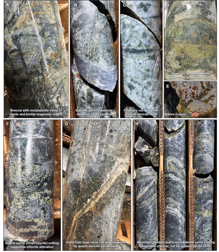 Assays have not yet been received from the drilling completed to date, however, interpretation of geologic logging in the initial 1,100 meters of drilling confirms the presence of stockwork quartz veins, early halo veins, minor chalcopyrite with abundant pyrite, and banded quartz-molybdenite veins – classic indicators of proximal portions of a porphyry copper system (Figure 5B, G, H). The identification of molybdenum-rich veins, often found outboard of the high-copper shell in porphyry systems, suggests that current drilling may have intercepted a high-molybdenum shell adjacent to the center of the Climax porphyry system(s). Abundant sericite-chlorite alteration suggests drilling to date tested flanking or upper levels of the system. Increasing chalcopyrite-to-pyrite ratios in core toward areas with the highest-magnitude copper-in-soil (up to 0.2% copper) and molybdenum-in-soil values provide compelling evidence for potentially stronger mineralization in future holes.
